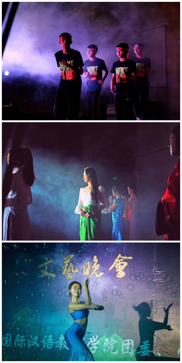 小品《甄嬛出宫计》一改原剧细腻华美的画风,加入了诙谐幽默的言辞,男女反串加以创新,惟妙惟肖的表演将晚会带人热潮。随着热烈的掌声,泰国、老挝留学生缓缓步入舞台,为我们纵情演绎了《泰国+老挝传统舞蹈》,随后IN街舞社的社员们带来引得全场欢呼的《跳西游》。我们的国粹京剧却也别有一番韵味,京剧社和汉服社带来的《京剧梨花颂》带着整齐划一的京剧唱腔,独具中华特色的服装,摇曳生姿的舞步掀起了晚会的小高潮。一只手鼓、一把吉他、两个人——节目《safe and sound》将两种不可思议的乐器结合在一起,配合女主唱优美空灵的歌声,全场观众都屏息倾听,安静的欣赏。随后舞蹈《玉生烟》将中华璞玉的纯美、坚忍、含蓄的情感清晰地表达出来,优美的舞姿配上悠扬的歌声,为观众们带来了一场精妙绝伦的视听盛宴,让观众沉醉其中。悠扬的古典音乐,蕴含了中国文化优柔,美好的内涵;说唱与歌曲的结合,现代与古典的融合,展现了我院在面向国际的同时,也不忘中华古典文化之美。